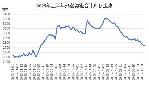 上半年由于煤炭供需关系持续宽松,煤价不断下行,跌幅均值在20%以上。产量方面,2025年上半年国内原煤产量整体保持同比增长趋势,据国家统计局数据,1-5月全国原煤产量达到19.9亿吨,同比增长6%;库存方面,上半年北方港口煤炭库存整体持续处于历史偏高水平,持续累库至5月月中创历史最高水平后回落,截至6月30日环渤海港合计煤炭库存在2765.4万吨,较年初累计增加224.4万吨,增幅在8.83%。