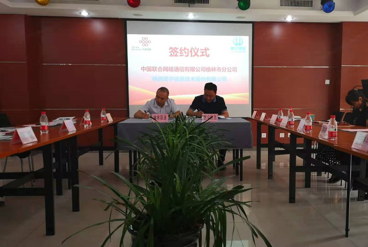 中国联通榆林分公司总经理陈锴与思宇信息总经理李晓刚代表双方签订战略合作协议。